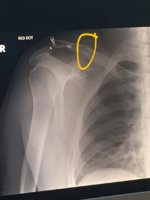 Ouch! I can sympathize with that, I got collected a few years back, my right collarbone is held on with titanium screws and false ligaments. Factory.