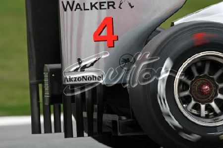 McLaren Pod: stranger rumours suggest the quite strong looking struts are hydraulic and move the wing to replicate different flex, the results can then be measured in order to engineer subsequent wings to flex in a similar manner. the hydr set up is legal for testing, then as RBR proved last year a wing can flex as long as it meets the FIA test